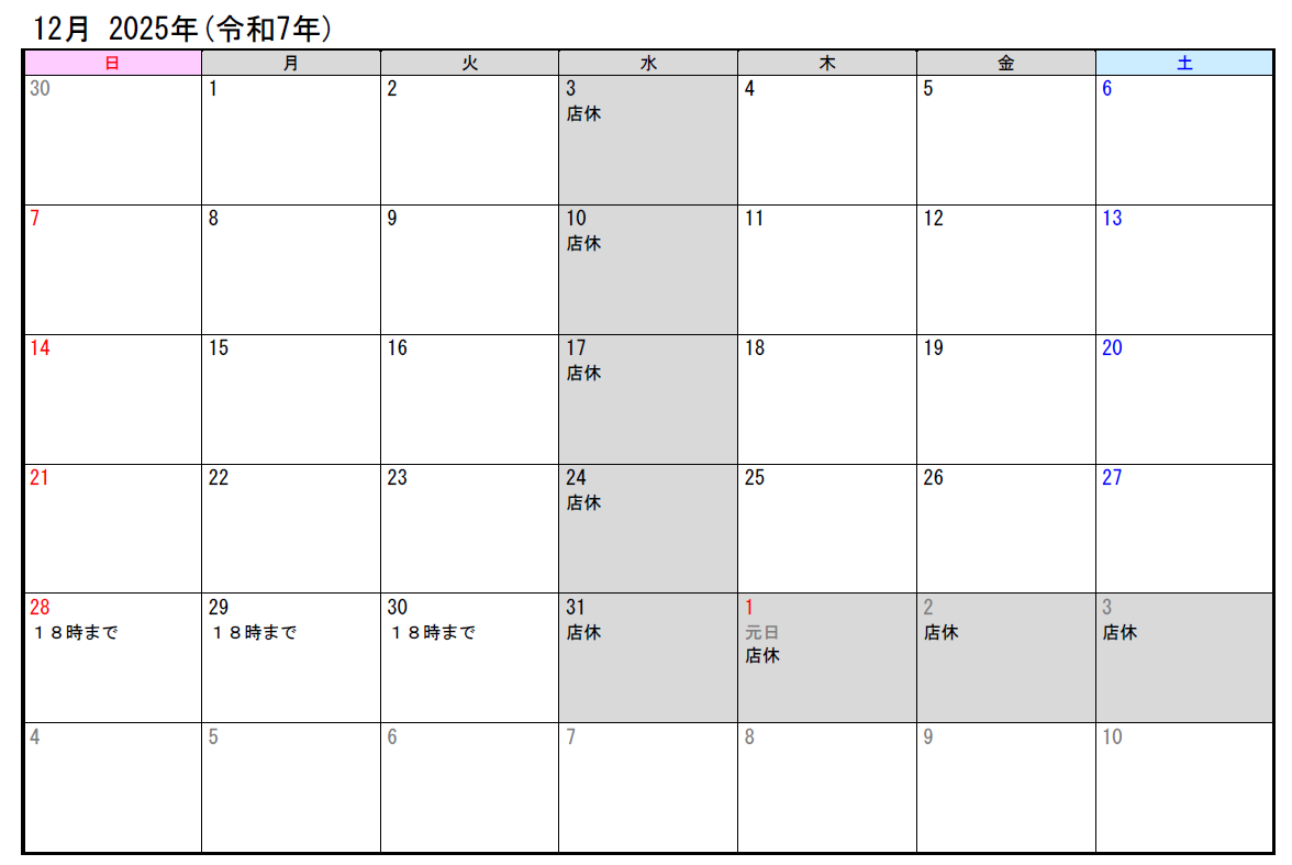年内は30日が最終営業日、年明け令和8年は1月4日11時から営業いたします